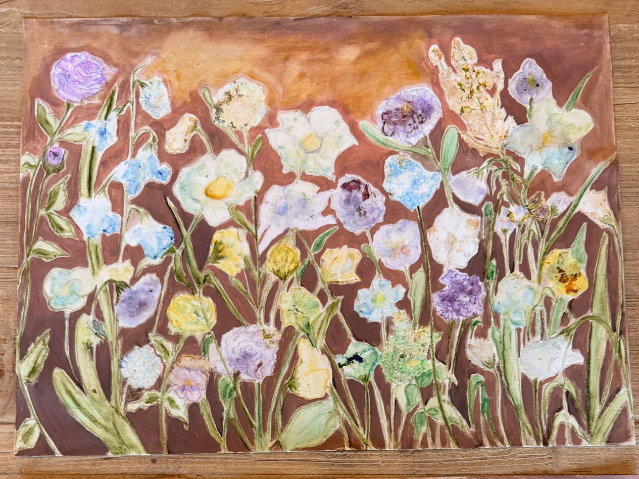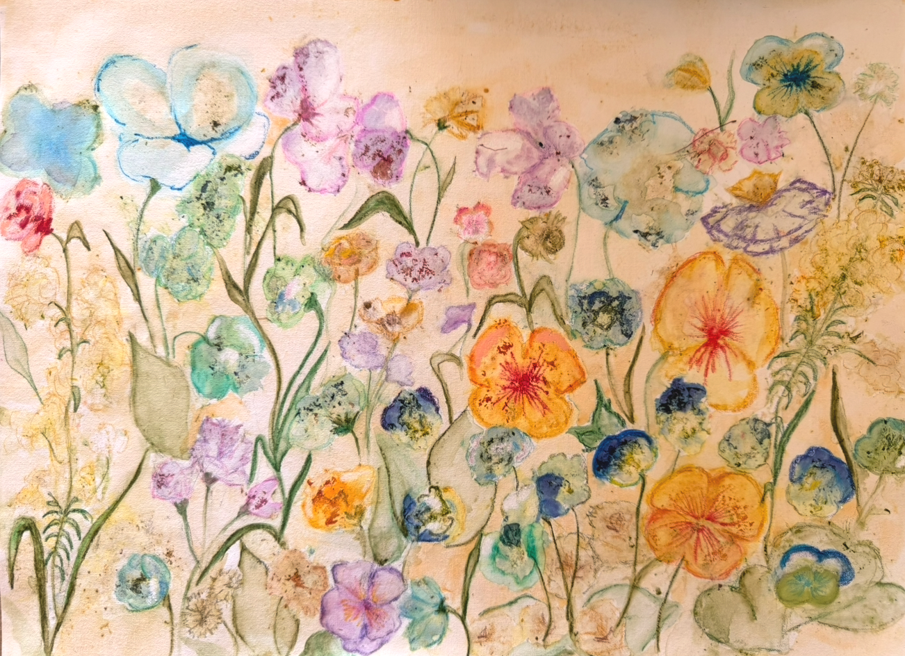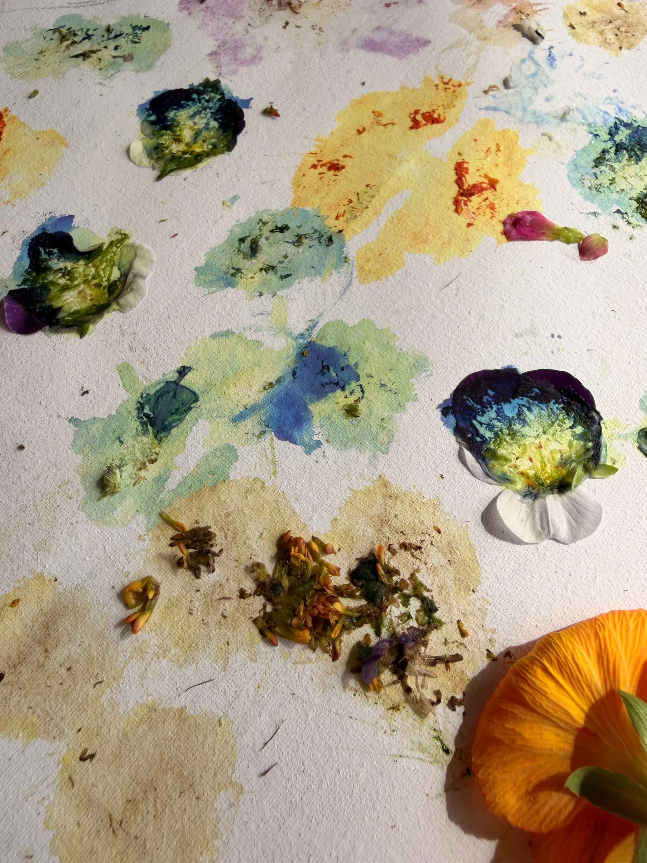 Each work begins with botanical pigment transfers, created by pressing cultivated flowers to release their natural dyes directly onto the canvas. These impressions form an unpredictable, organic base that I build upon with paint, discovering the form of each flower as I work. The result is a dialogue between the raw material of the plant and my interpretation of nature as both an artist and gardener.