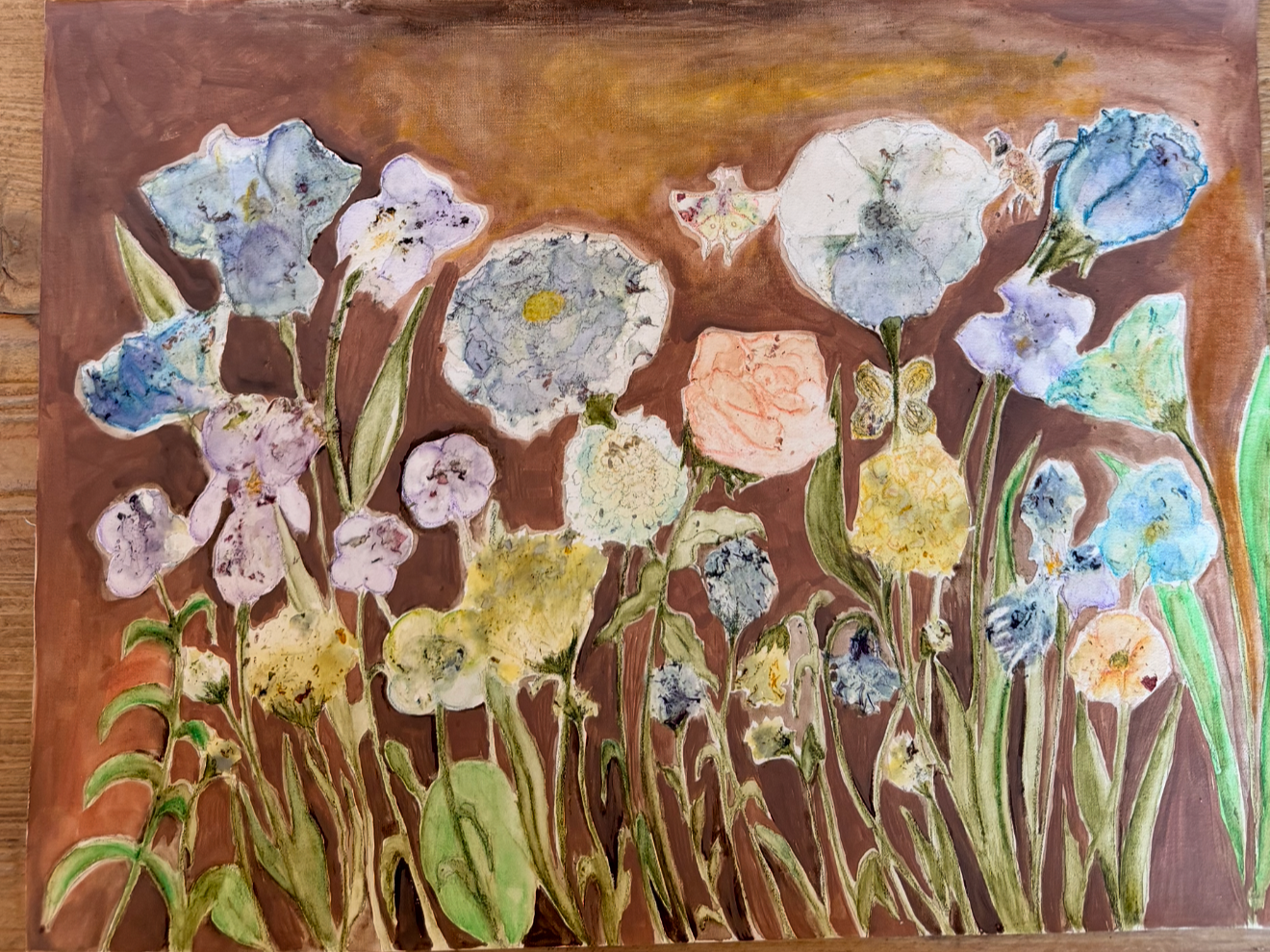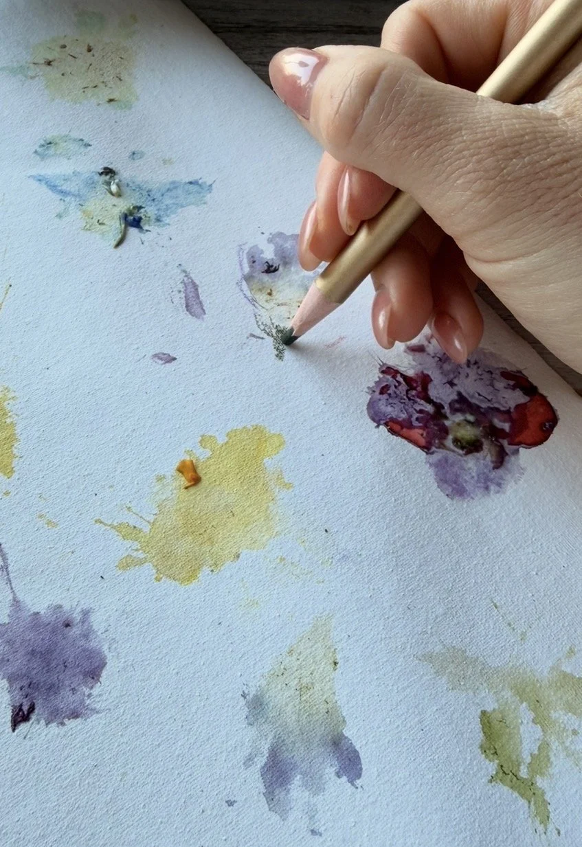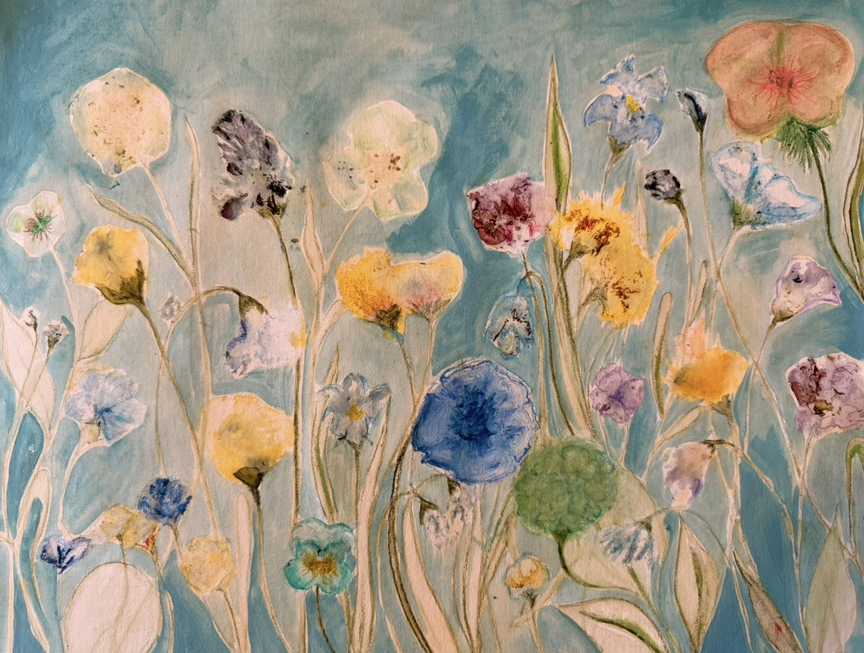Each work begins with botanical pigment transfers, created by pressing cultivated flowers to release their natural dyes directly onto the canvas. These impressions form an unpredictable, organic base that I build upon with paint, discovering the form of each flower as I work. The result is a dialogue between the raw material of the plant and my interpretation of nature as both an artist and gardener.