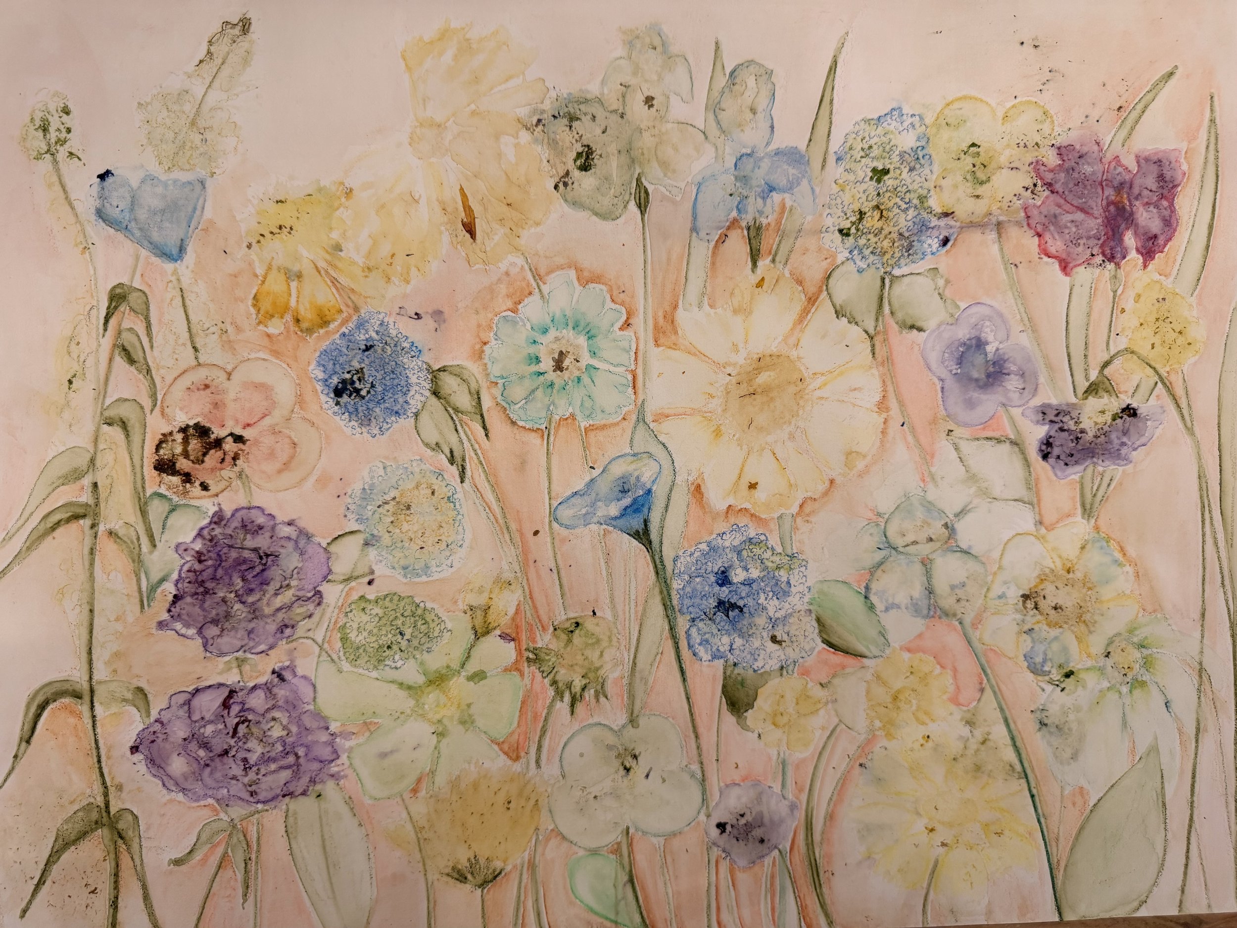 Each work begins with botanical pigment transfers, created by pressing cultivated flowers to release their natural dyes directly onto the canvas. These impressions form an unpredictable, organic base that I build upon with paint, discovering the form of each flower as I work. The result is a dialogue between the raw material of the plant and my interpretation of nature as both an artist and gardener.